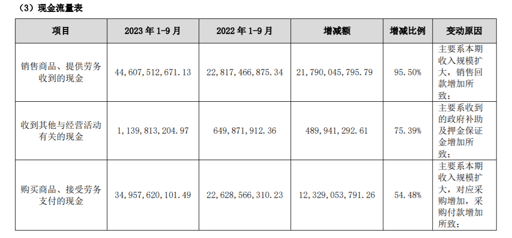 企业截至三季度末的货币资金为111.8亿元,同比大增56%;销售商品、提供劳务等收到的现金为446.1亿元,经营活动产生的现金流量净额为45.52亿,同比2022年有大幅度的提高。筹资活动方面表现平稳,为21.09亿,与去年同期的21.8亿类似。